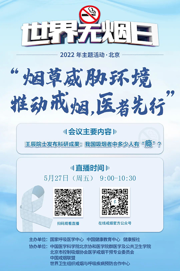 2022年5月31日是第35个世界无烟日,主题为“烟草威胁环境”,国家卫生健康委将“开展戒烟─医者先行活动”定为今年重点活动之一。为此,国家呼吸医学中心、中国健康教育中心、健康报社将于2022年5月27日联合主办主题活动。