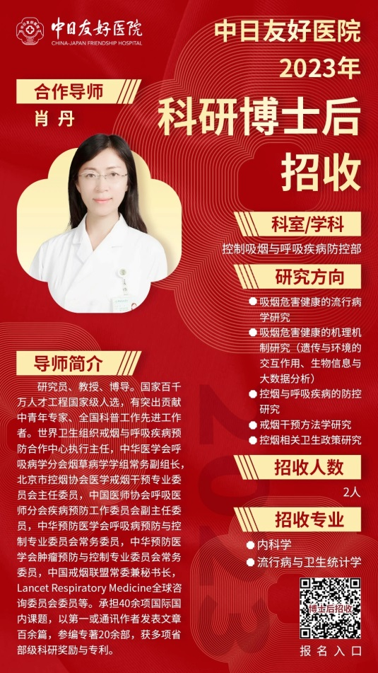 为加快高层次创新型青年人才培养,推动烟草病学领域科研和技术创新,中日友好医院烟草病学课题组现公开招收科研博士后,热忱欢迎优秀青年才俊加入我们!
